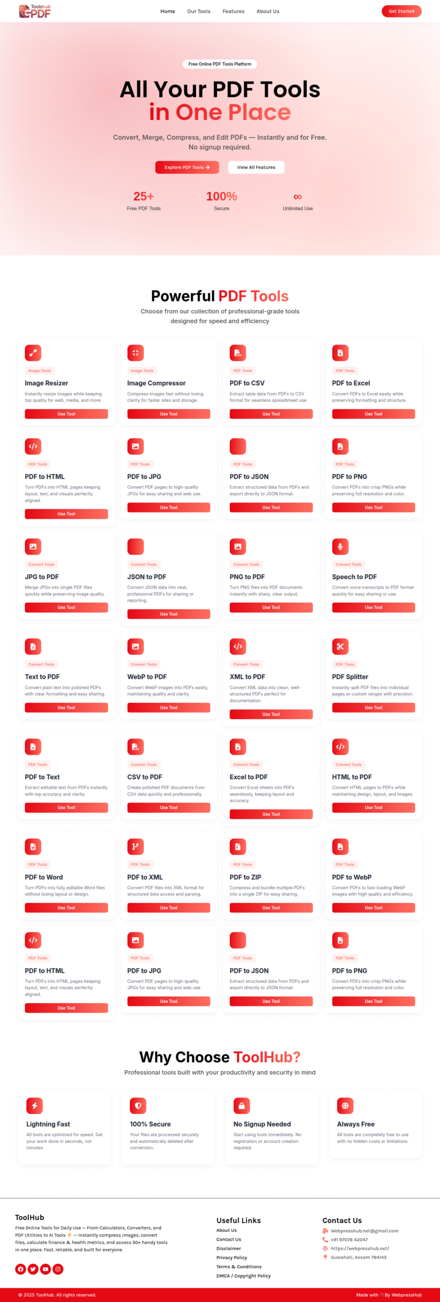 This all-in-one website template comes packed with 25+ high-demand online PDF tools, covering every essential file conversion and editing function — from compression and merging to format conversions and security features.